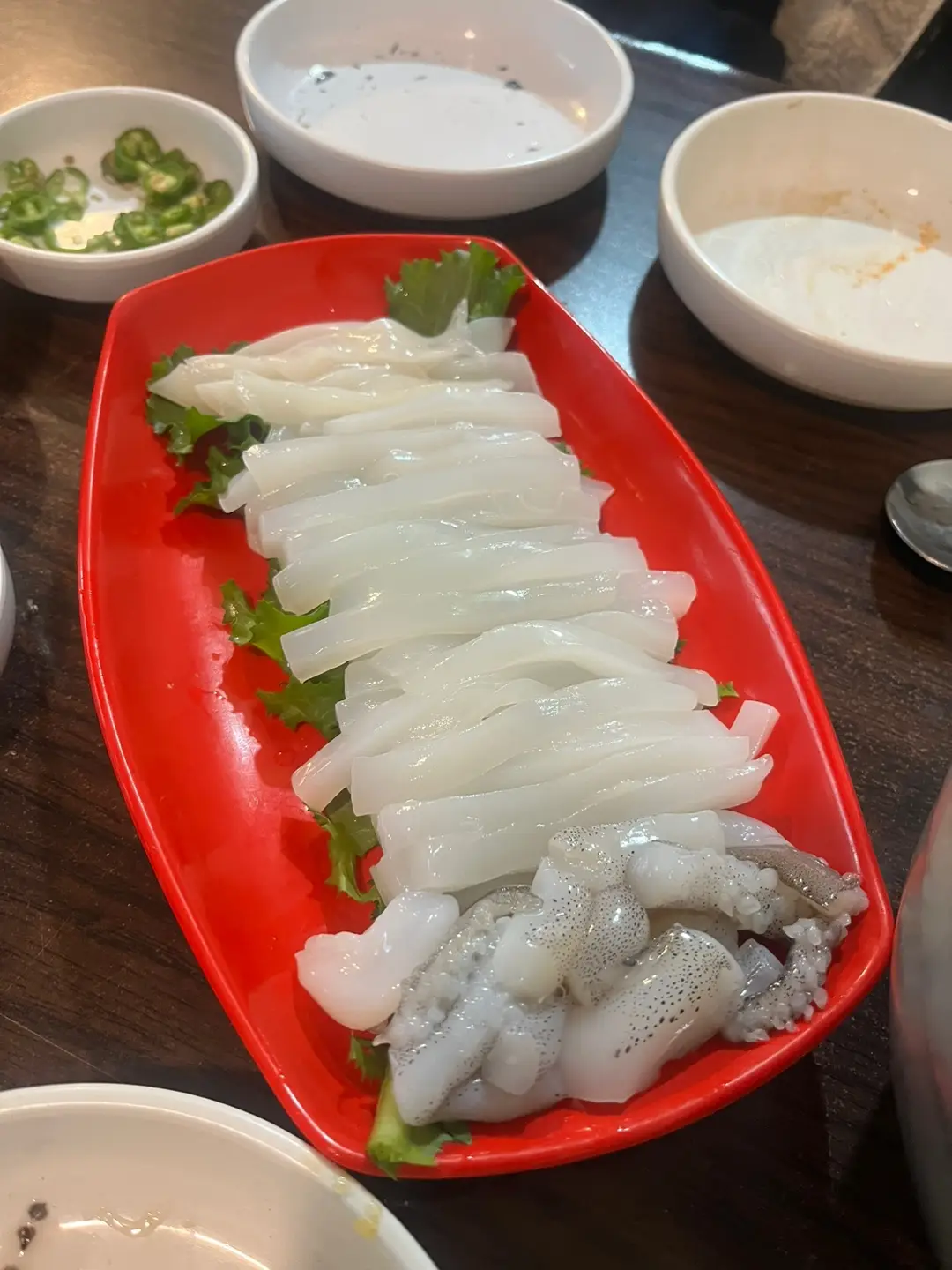 1) 무늬오징어는 꼭 먹어볼 만하다. 제철 수산물을 판매하기 때문에 신선하고 맛있는 해산물을 먹어볼 수 있습니다. 특히, 회를 찍어멀 수 있는 된장, 다진마늘, 청양고추, 참기름을 섞은 소스를 주는데 너무 맛있었습니다. 회는 간장에 와사비가 젤 맛있는 줄 알았는데, 여기 소스 너무 맛있었고 추천합니다. 와사비와 고추는 그렇게 맵진 않아서, 추가해서 많이 얹어 먹었습니다.